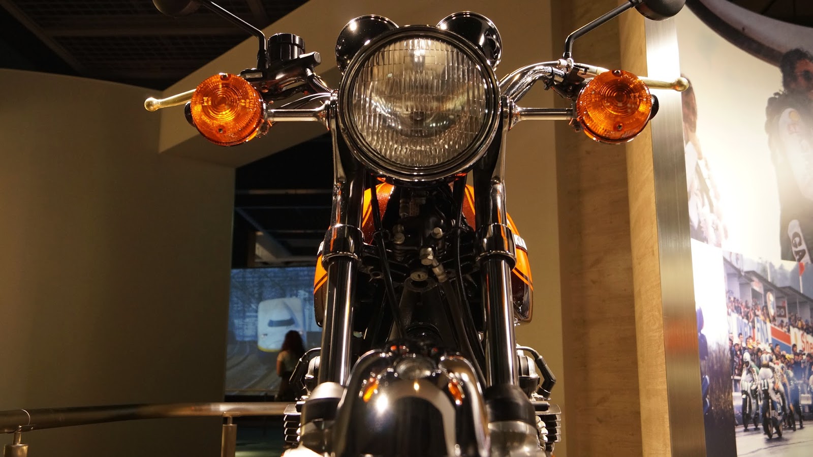 すらっと伸びたフロントフォーク・インナーチューブ 同時代の重量車は押並べて蛇腹ゴムのフォークブーツ付きだったのを 考えると画期的です |